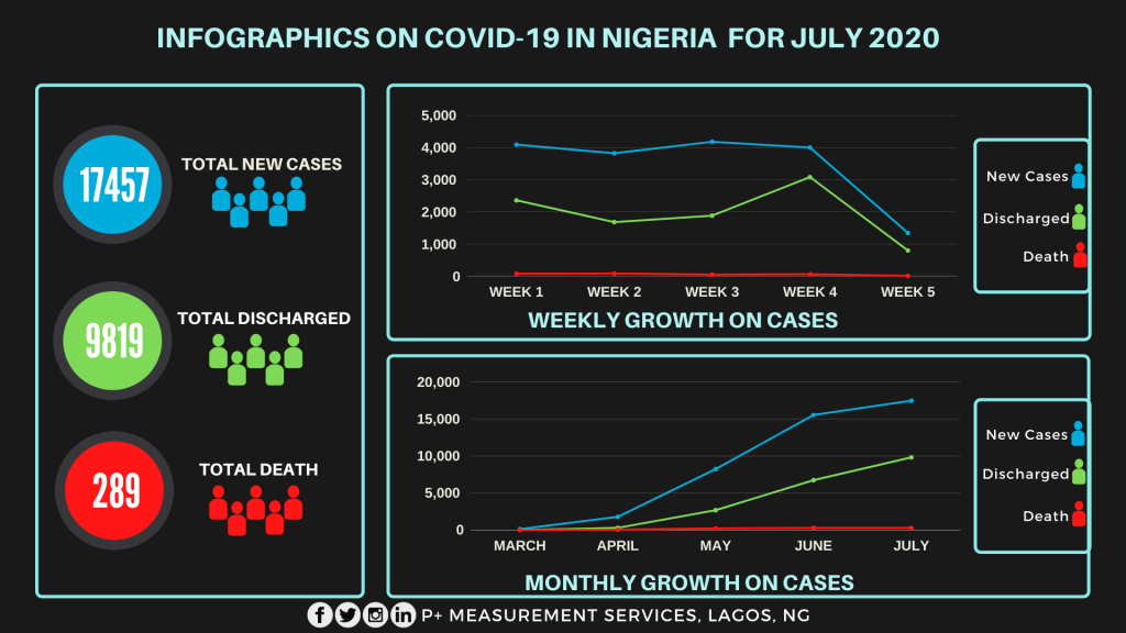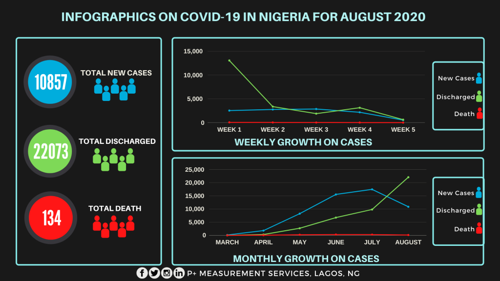 P+ Measurement Services analysts in its monthly review noted that the country has seen a massive drop in the number of new cases and deaths and an increase in the number of recoveries in the month of August. According to data gathered from the website of the Nigeria Centre for Disease Control (NCDC), a total number of 10,857 confirmed cases, 22,073 persons discharged and a total number of 134 deaths were recorded in August. This brings the total figure to 54,008 total number of confirmed cases, 41,638 number of discharged persons and 1,013 deaths since the virus made its way into the country.
